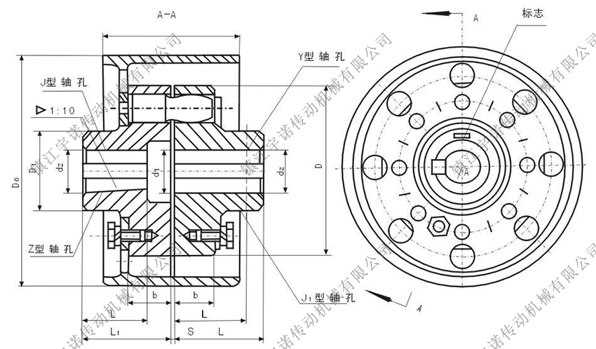 該聯(lián)軸器已列為國家標(biāo)準(zhǔn)GB5014-2003,適用于各種機(jī)械聯(lián)接兩同軸線的傳動(dòng)軸,通常用于動(dòng)頻繁的高低速運(yùn)動(dòng)。工作溫度為-20~+80℃;傳遞公稱轉(zhuǎn)矩為560~35500N.m,許用轉(zhuǎn)速為5600~950r/min。軸孔型式有圓柱形(Y)、圓錐形(Z)和短圓柱形(J)。 軸孔和鍵槽按國家標(biāo)準(zhǔn)GB3852-83《聯(lián)軸器軸柱和鍵槽形式及尺寸》的規(guī)定加工。
