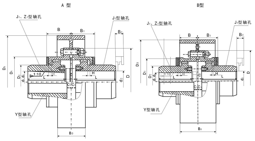 NGCL型帶制動(dòng)輪鼓形齒式聯(lián)軸器在工作時(shí),兩軸產(chǎn)生相對角位移,內(nèi)外齒的齒面周期性作軸向相對滑動(dòng),必然形成齒面磨損和功率消耗,因此,齒式聯(lián)軸器需在有良好和密封的狀態(tài)下工作。齒式聯(lián)軸器徑向尺寸小,承載能力大,常用于低速重載工況條件的軸系傳動(dòng),高精度并經(jīng)動(dòng)平衡的齒式聯(lián)軸器可用于高速傳動(dòng),如燃汽輪機(jī)的軸系傳動(dòng)。